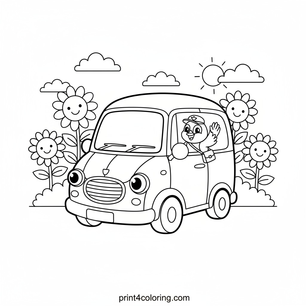Join the super cute mail van on its morning route! With big, happy headlights for eyes, it gently drives past a garden bursting with smiling sunflowers. Look closely, a little bird postman is waving a friendly hello from the open window. A delightful scene ready for your brightest colors!
