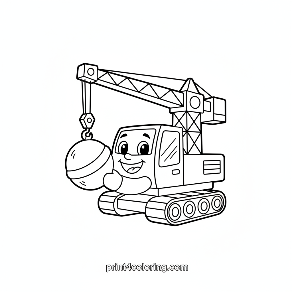 Meet Charlie the friendly crane! With his big, happy smile and kind eyes, he's carefully holding a super soft, giant marshmallow with his special 'wrecking ball' attachment. Imagine how squishy and sweet it feels! Get ready to add vibrant colors to Charlie and his fluffy treat in this delightful scene, perfect for little artists.