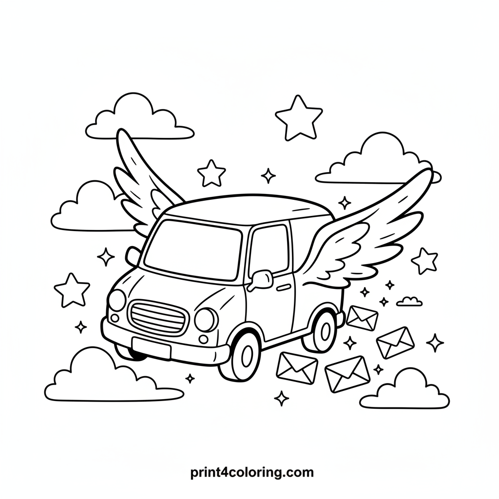 Imagine a wondrous mail van with shimmering, feathery wings, delivering special letters high above the world! It zips through fluffy clouds and twinkling stars, leaving a sparkling trail of magic mail. Get ready to color this enchanting scene and bring its whimsical journey to life!