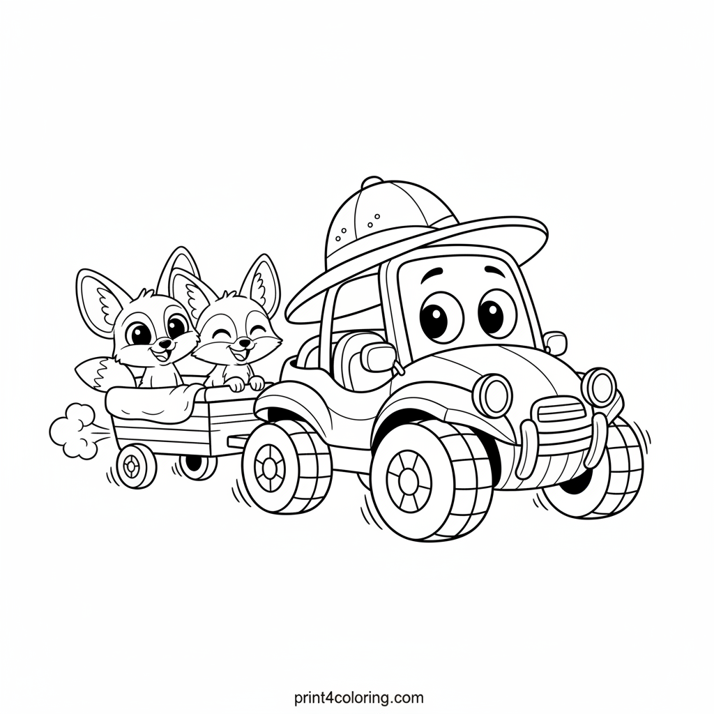 Join the hilarious safari buggy, with its goofy hat and googly eyes, as it bravely pulls a wagon of smiling desert pals! A happy meerkat and giggling fennec fox enjoy the ride, while the buggy puffs funny smoke clouds and its tires spin with cool patterns. A wonderfully whimsical scene for creative colorists!