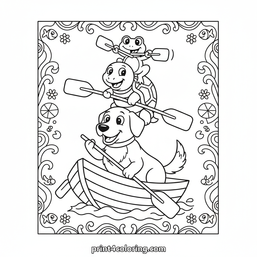 Join a hilarious adventure as a tiny frog, a calm turtle, and a happy dog stack up in a wobbly rowboat! With oversized oars and surprised smiles, they're trying their best to paddle across the water. This comical scene is filled with friendly faces and silly antics, perfect for a fun coloring session!