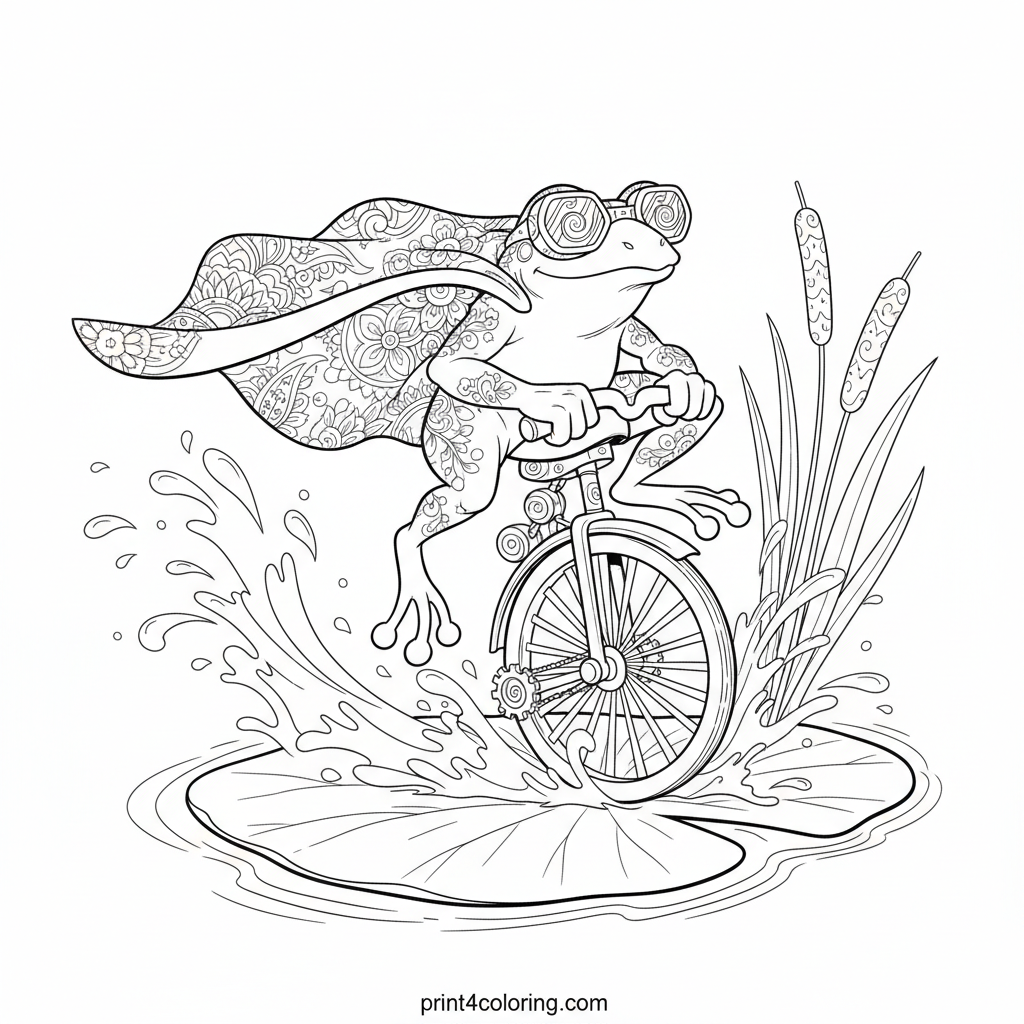 Witness the incredible Froggy Daredevil! Our cheerful frog, with goggles and a cape, is caught mid-air on its unicycle, launching from a lily pad ramp. Powerful legs extend, creating exciting water splashes! Swirling patterns and cattails frame this dynamic scene. Get ready to add vibrant colors to this daring, acrobatic adventure!