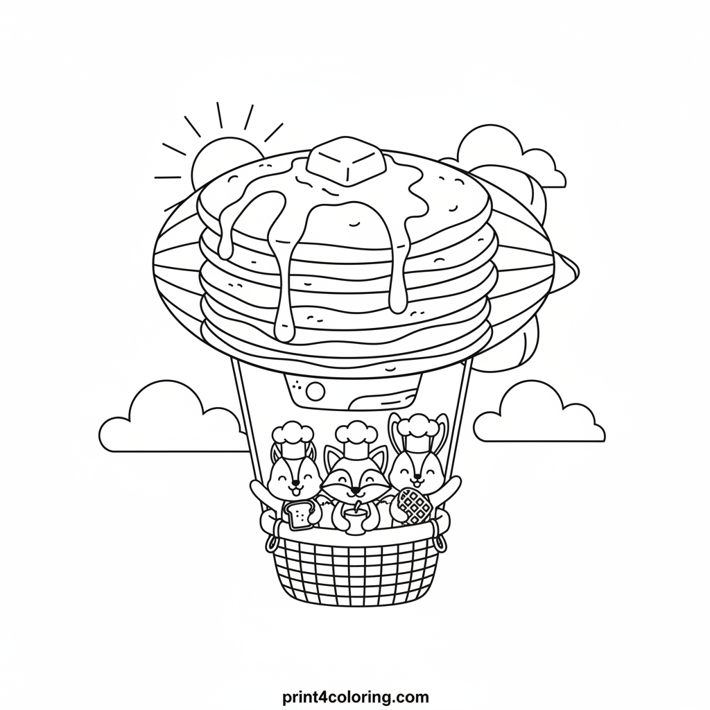 Soar into a world of breakfast magic! This whimsical coloring page shows a giant blimp shaped like a fluffy pancake stack, topped with melting butter and sweet syrup. Adorable chef animals fly in a basket below, ready to deliver delicious breakfast treats. Get ready to color this imaginative sky adventure!