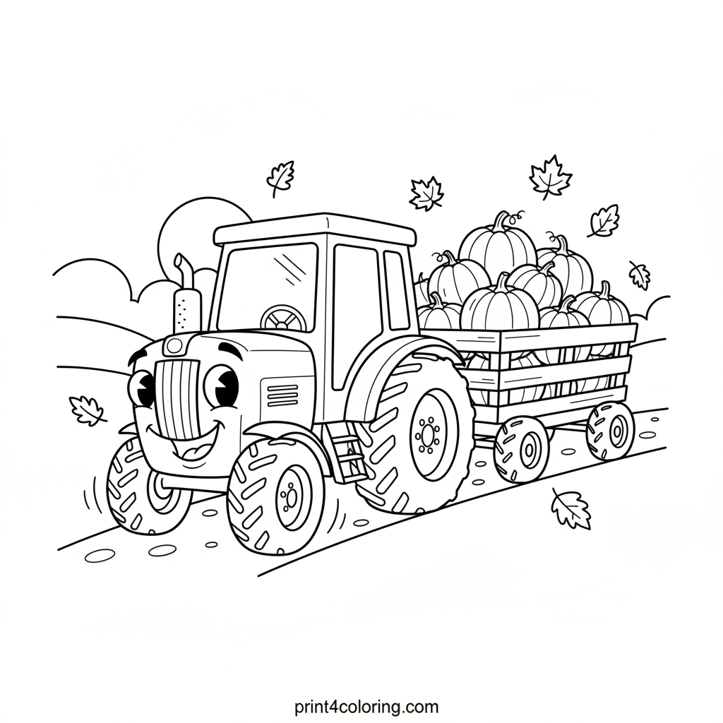 Get ready for a fun autumn adventure! A powerful farm tractor pulls a wagon piled high with plump, round pumpkins down a dirt path. Colorful autumn leaves gently drift down around them. Imagine the sounds of the farm and the smell of fall as you color this exciting harvest scene!