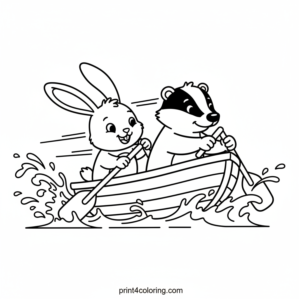Imagine a thrilling race on the river! Join a speedy rabbit and a strong badger as they paddle their rowboat with all their might. Watch the water splash playfully around them as they dash towards the finish line. This exciting scene is packed with action and friendship, ready for your brightest colors.