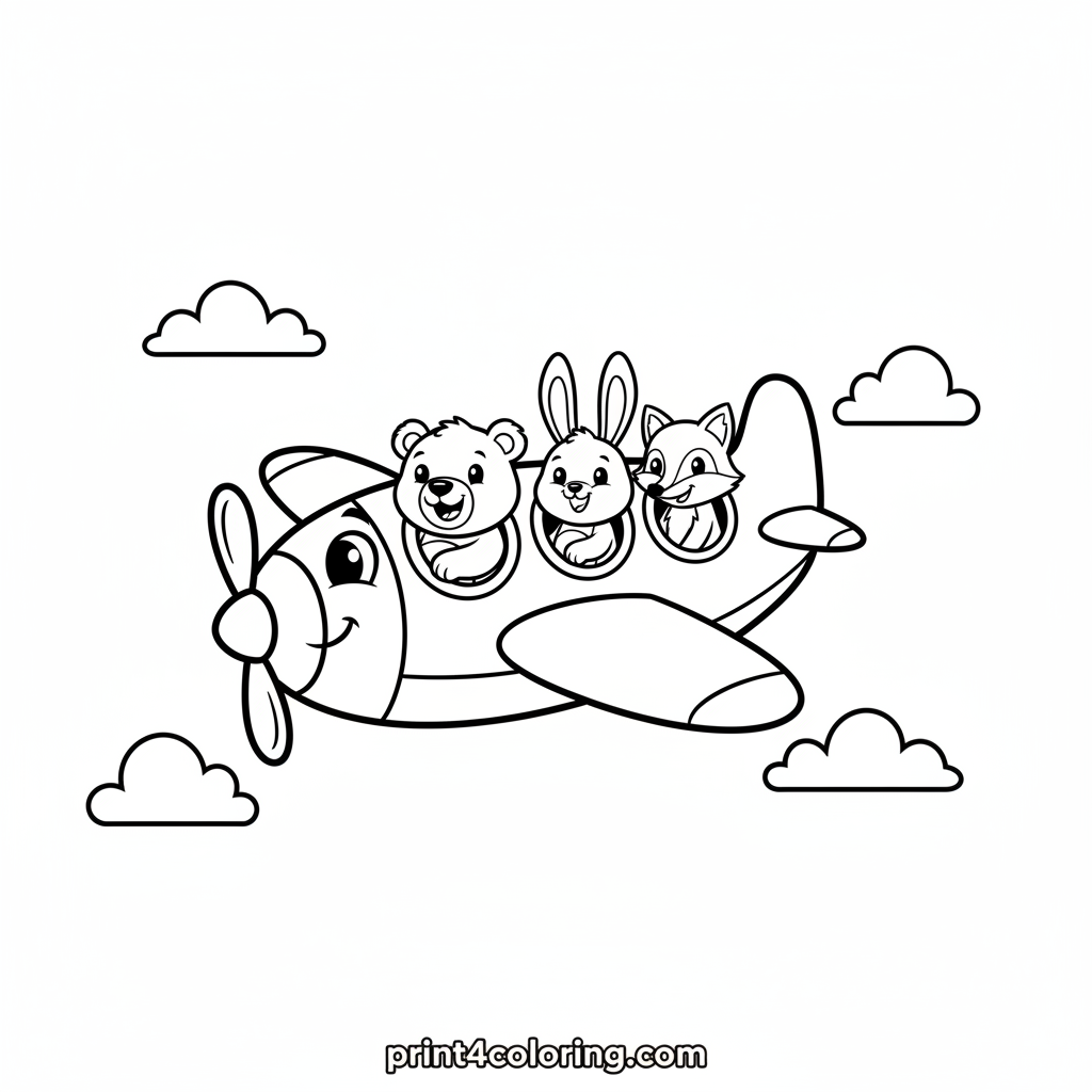 Join the happy little airplane on its first gentle flight! This cute, smiling cartoon plane, with friendly eyes, carries cheerful animal friends. Spot the cozy bear, curious rabbit, and clever fox peeking out windows as they glide through the clear sky. A delightful adventure for young colorists!