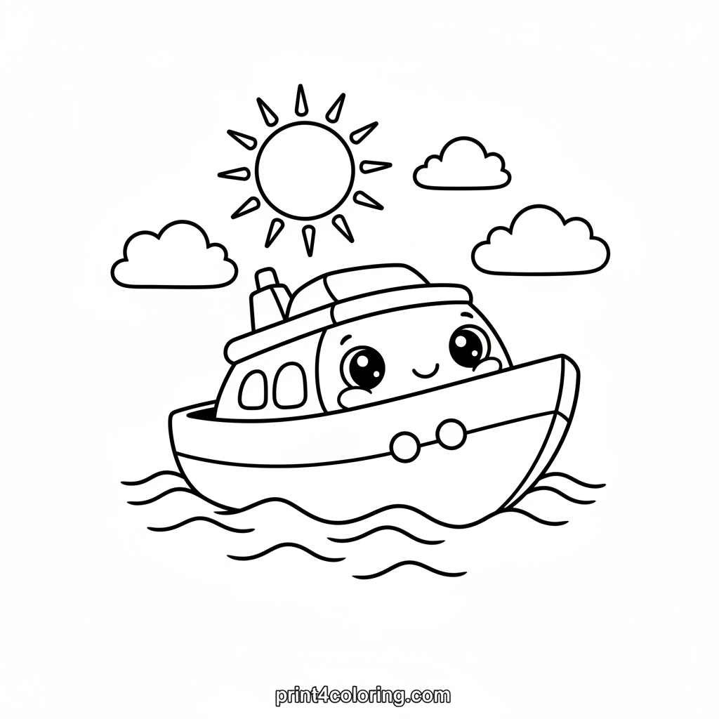 Set sail for fun with our happy little yacht! This cute, round boat has big friendly eyes and a gentle smile, making it perfect for young colorists. Watch it happily bob on simple, wavy water under a bright, sunny sky. A delightful scene for imaginative play and artistic expression!