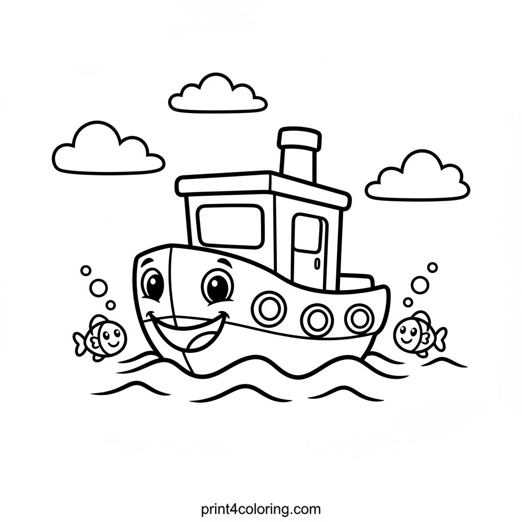 Embark on a delightful coloring adventure with a cheerful tugboat! This friendly boat has a big, happy smile and kind eyes, gently floating on calm, wavy water. Two little smiling fish swim nearby, making this a joyful scene. Bring this happy moment to life with your favorite colors!