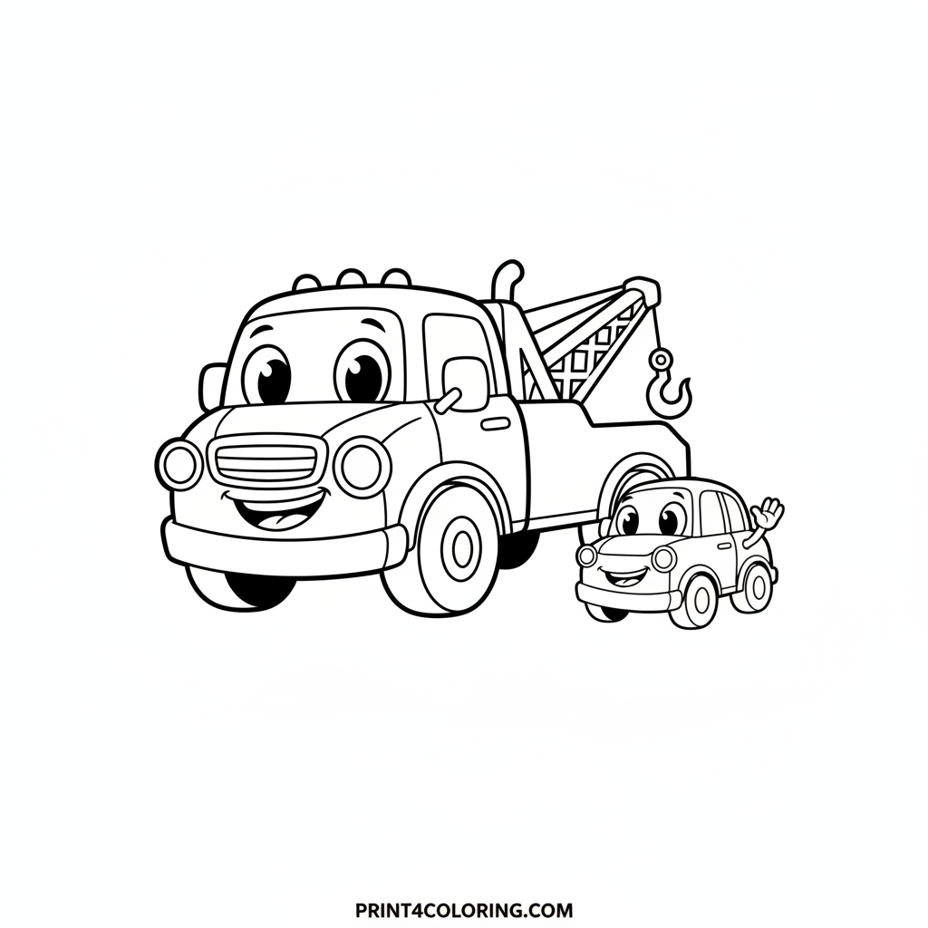 Meet our friendly little tow truck, always ready to help! With big, kind eyes and a cheerful smile, he's gently towing a happy toy car. Look, the toy car is even giving a friendly wave! Imagine all the bright colors you can use to bring this helpful duo to life on your page.