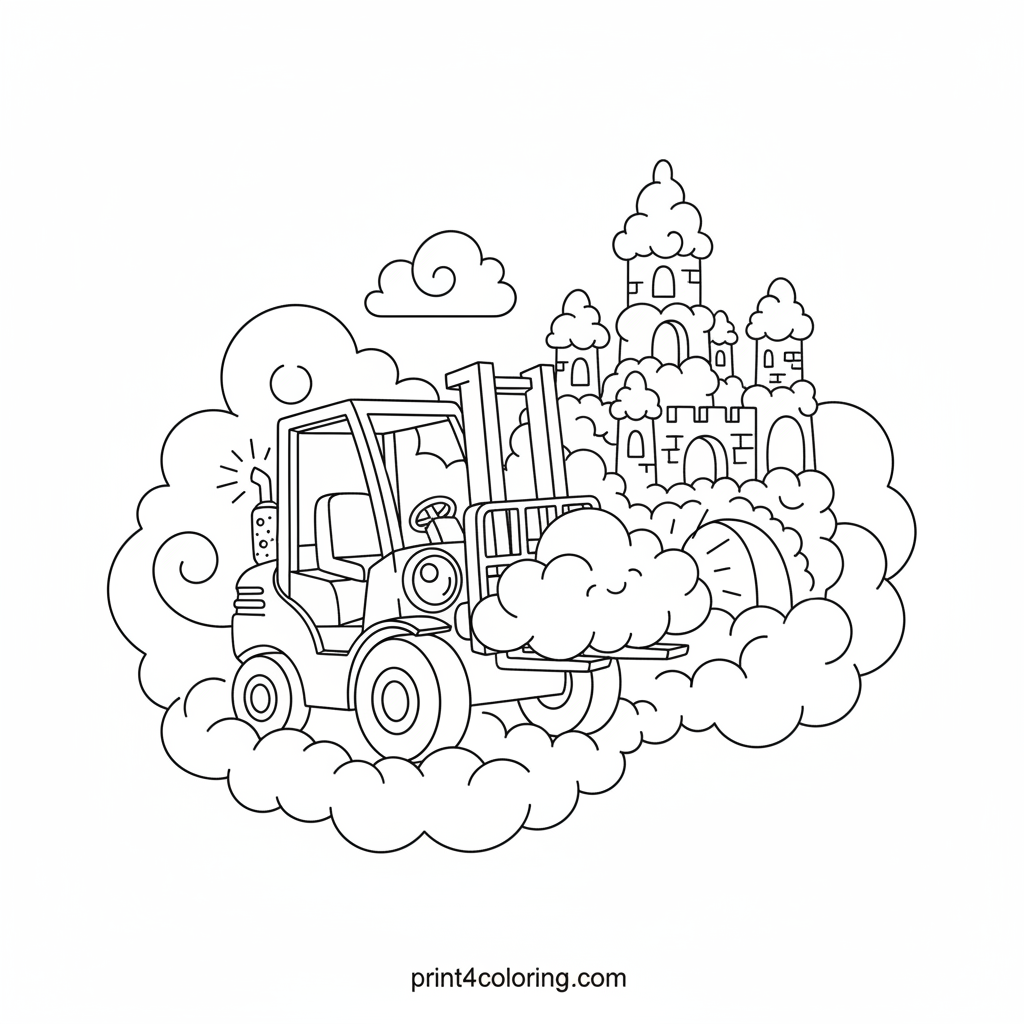 Soar into a dreamy sky where a magical forklift, glowing softly, is hard at work! Watch as it carefully stacks fluffy, wispy clouds, building a magnificent, fantastical cloud castle high above the world. Let your imagination take flight as you color this enchanting aerial scene.