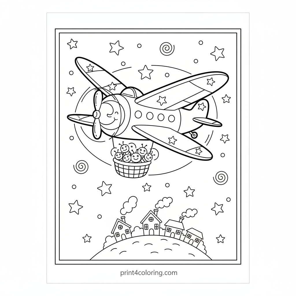 #airplane#magical#night-sky#stars#fireflies#fantasy#whimsical#coloring-page#printable