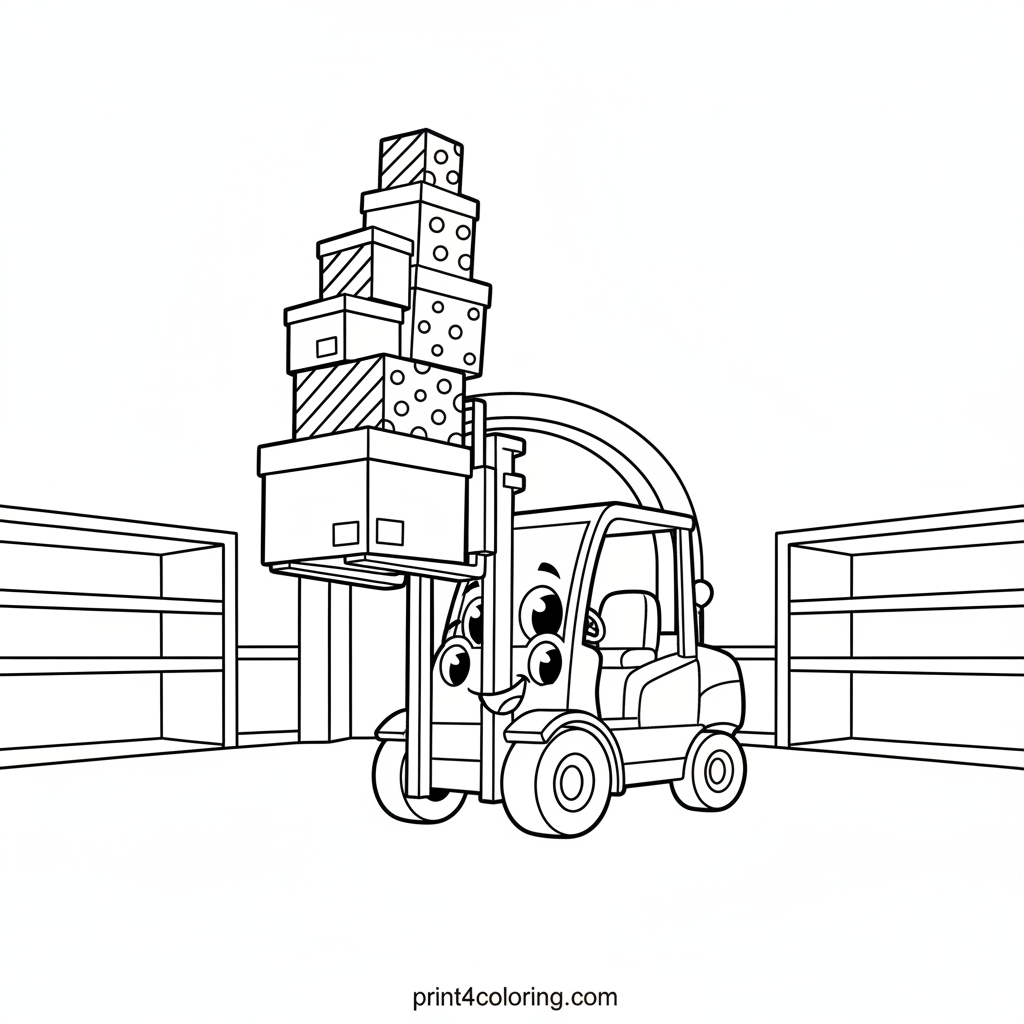 Get ready for an exciting challenge! This coloring page features a powerful forklift, its forks reaching high, carefully transporting a wobbly tower of brightly patterned boxes. Imagine the focus needed to balance such a tall stack as it moves across the smooth floor. What colors will you use to make this busy scene come alive?