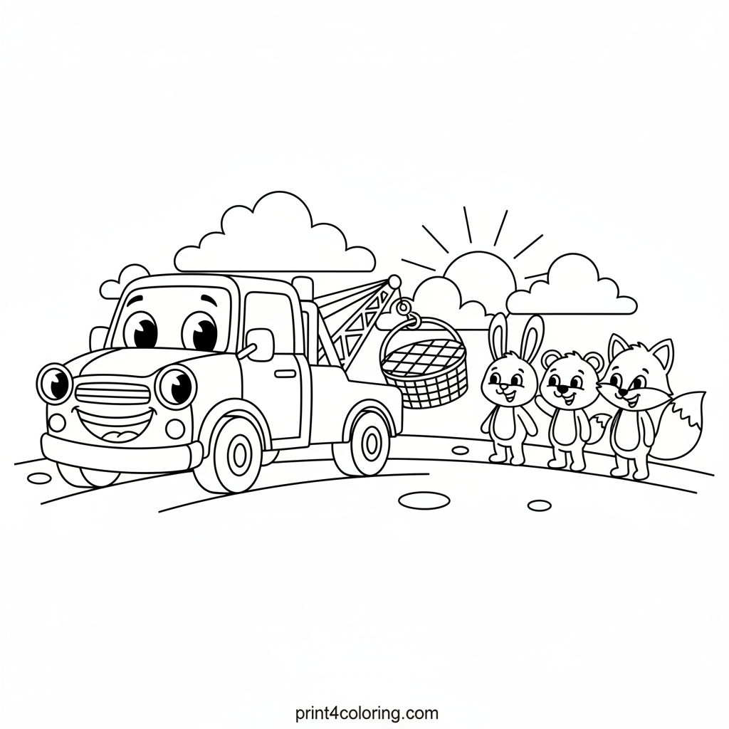 A friendly tow truck is on a special mission to help! A family of cute animal friends has lost their picnic basket, and it's rolling away. See the kind tow truck gently pull it back to safety, saving their delicious lunch. A heartwarming scene of helpfulness and friendship, ready for your colorful touch!
