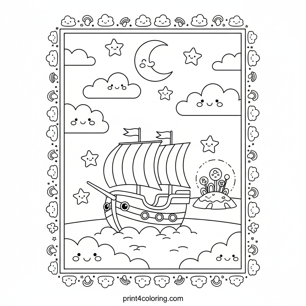 Embark on a whimsical adventure with a magical pirate ship soaring through soft, puffy clouds! Its sails shimmer with rainbow colors. Friendly stars twinkle and a smiling moon watches as the ship glides towards a mysterious, glowing island. Grab your crayons and bring this dreamy scene to life!