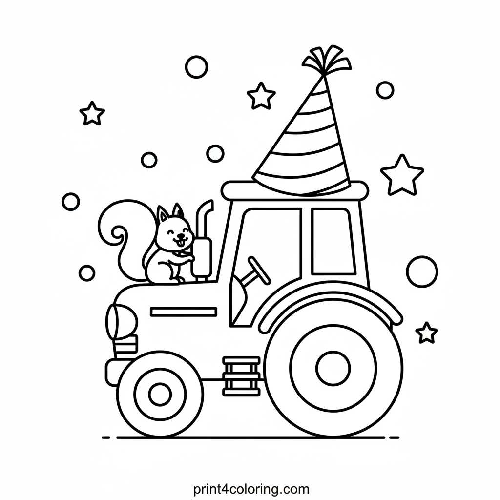 Get ready for a party on the farm! This happy tractor is sporting a huge, silly party hat, with bright confetti raining down all around. A cheerful squirrel has found the best seat on the hood, ready to join the fun. Grab your crayons and bring this festive farm scene to life!