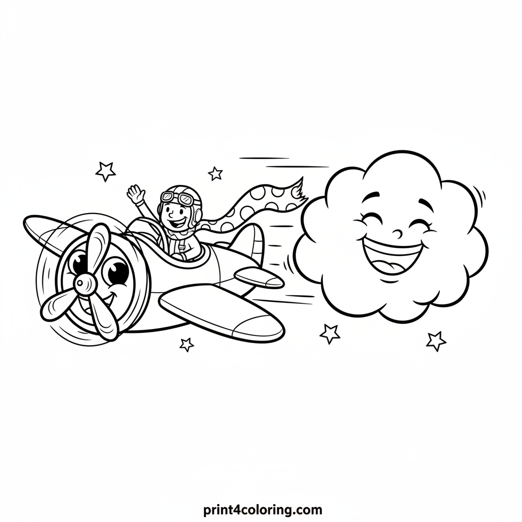 Zoom into a whimsical sky adventure! A quirky airplane, sporting a long polka-dot scarf, is playfully racing a fluffy, giggling cloud. A friendly pilot waves from the cockpit, inviting you to bring this cheerful aerial scene to life with your favorite colors. Who will win this silly race?