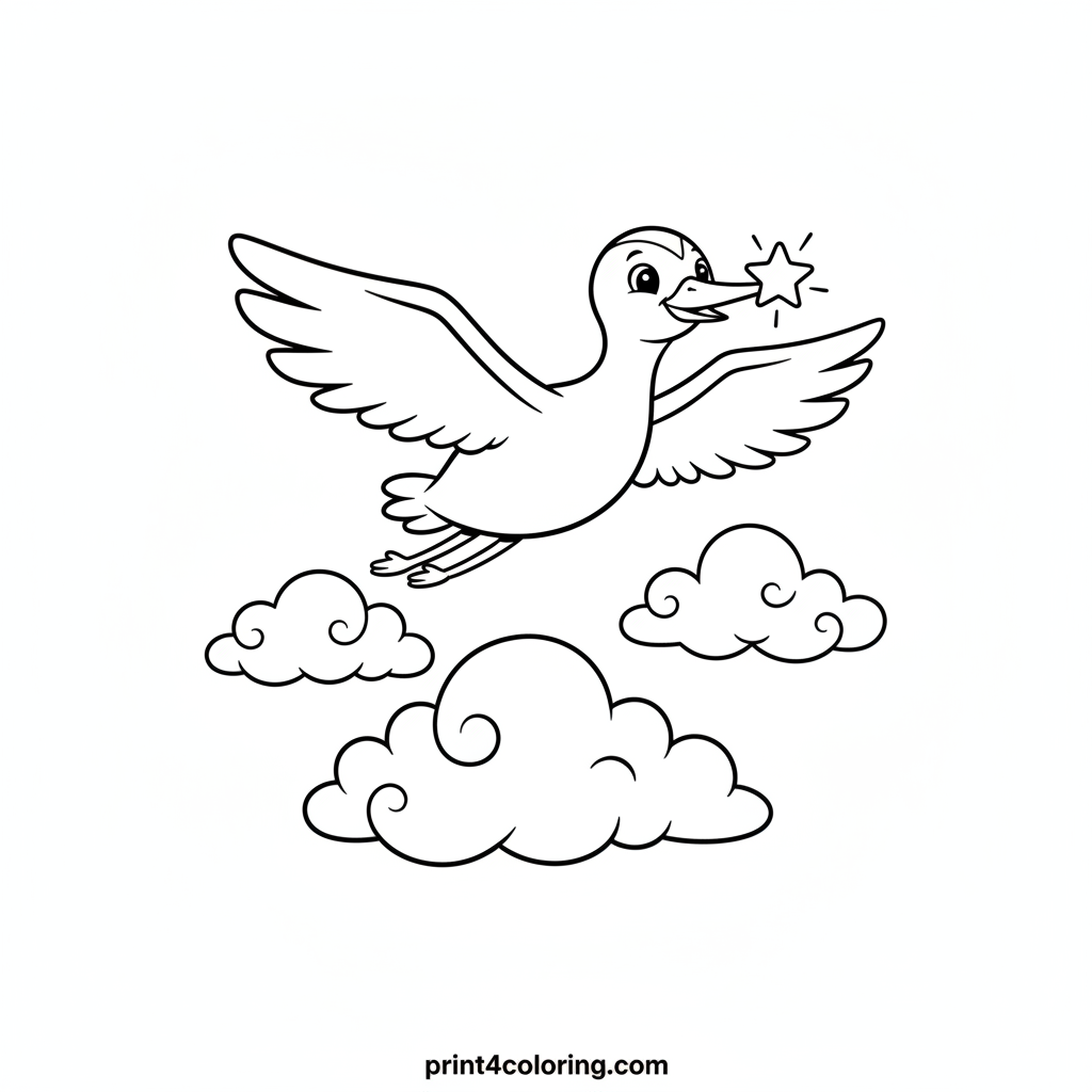 Imagine a gentle, mystical crane with subtly glowing feathers, gracefully soaring high above a dreamy cloud kingdom. It carries a tiny, twinkling star gently in its beak, ready to deliver it to the night sky. This magical bird brings wonder and light to its fluffy home. What colors will you choose for its enchanting journey?