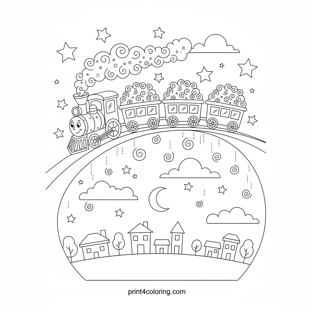 - 4🌈 **Peaceful Sleepy Town** - Color the town below with muted, gentle colors to show it's asleep. Soft grays, browns, and dark greens for buildings and trees will create a peaceful contrast to the vibrant train.