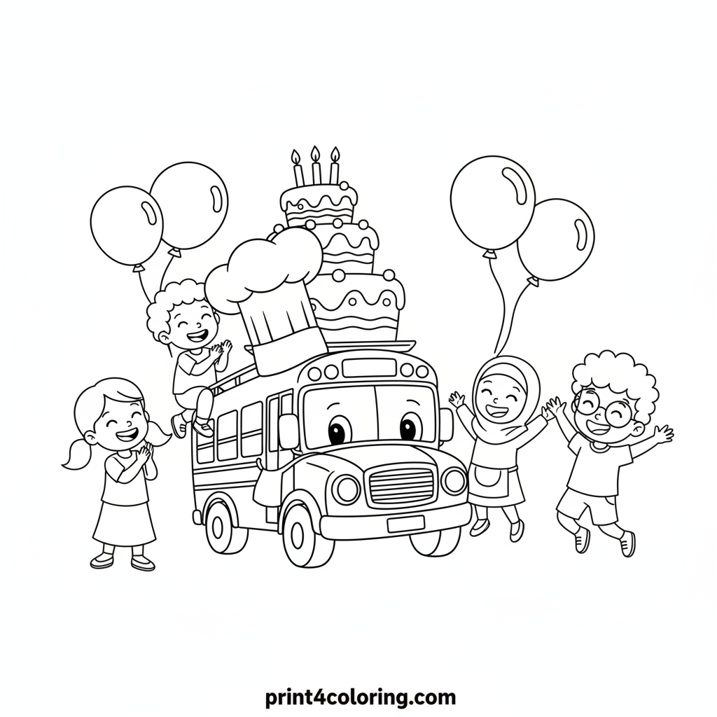 Get ready for a super sweet celebration! This coloring page features a hilarious school bus, dressed up as a master chef, making a special delivery. Watch as it brings a giant, yummy frosted cake to a lively birthday party, surrounded by happy children cheering and laughing. A delightful scene for budding artists!