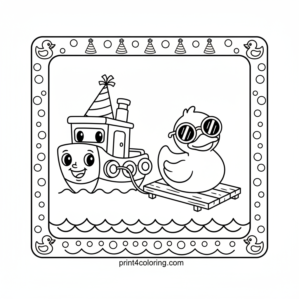 Get ready for giggles with this adorable tugboat! Sporting a bright striped party hat, it's playfully towing a small raft. On board is a giant, wobbly rubber duck wearing cool sunglasses! This cheerful parade is perfect for adding vibrant colors and bringing smiles to life.