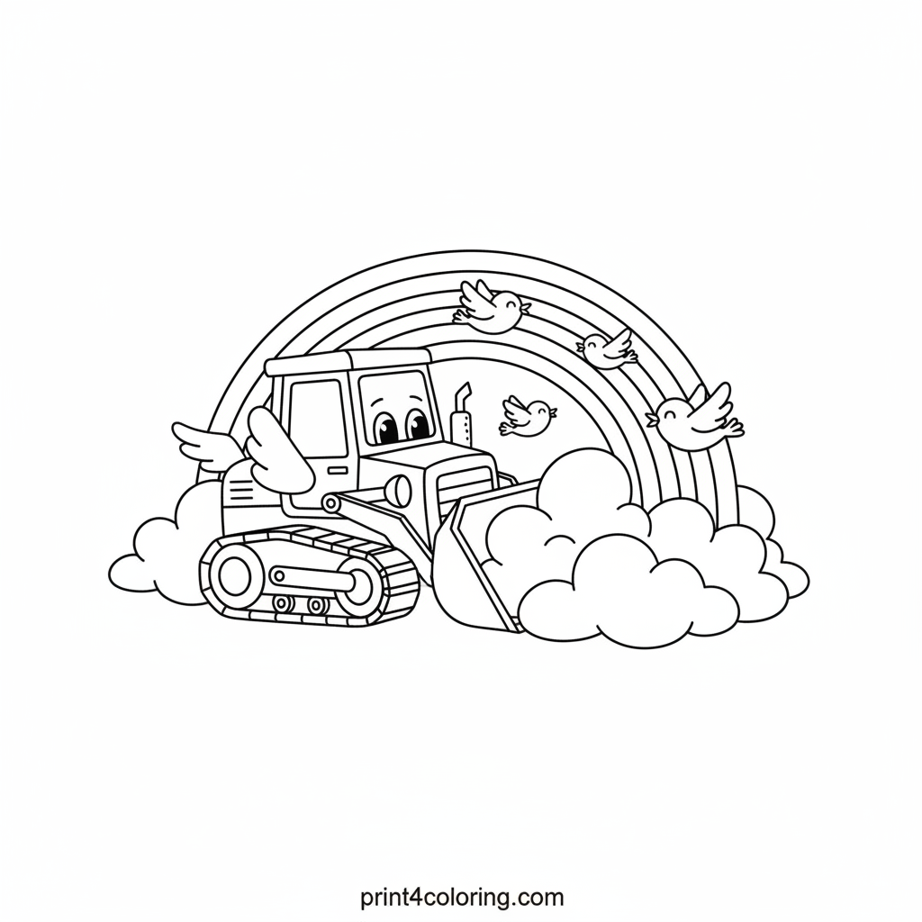 Join our magical bulldozer with tiny wings as it bravely pushes fluffy clouds, making way for a vibrant rainbow! Watch friendly birds chirp and fly alongside this gentle giant, creating a clear, colorful path across the sky. Add your brightest colors to this whimsical world of wonder and imagination.