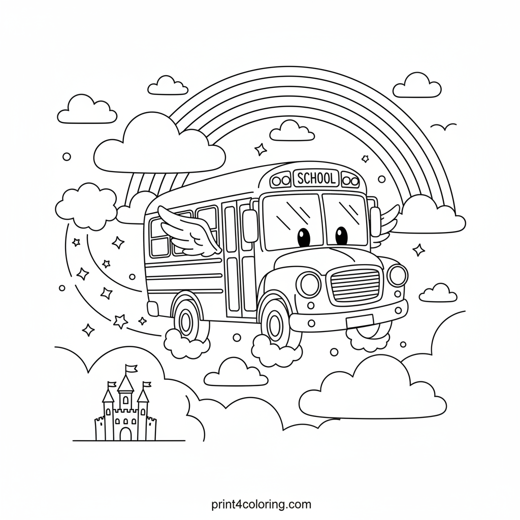 Hop aboard for a magical journey! This enchanting school bus, with its friendly wings and sparkling trail, soars gently through fluffy clouds. A vibrant rainbow arches across the sky as it heads towards a magnificent, whimsical castle in the distance. Get ready to color a world of wonder!