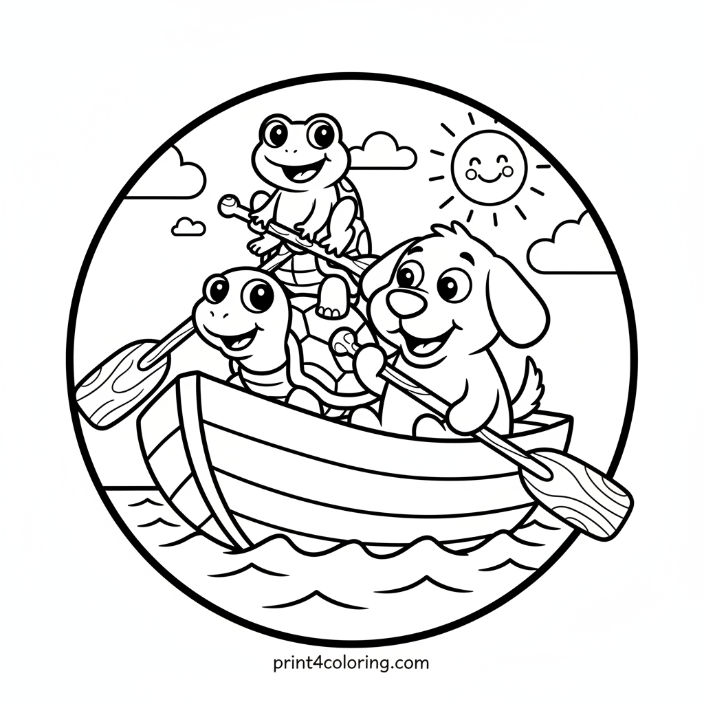 Get ready for giggles! A wobbly rowboat carries a comical stack of friendly animals – a frog on a turtle, on a dog! They're all smiling, trying to paddle with oversized oars on their surprising, joyful adventure. Bring this cute and silly scene to life!