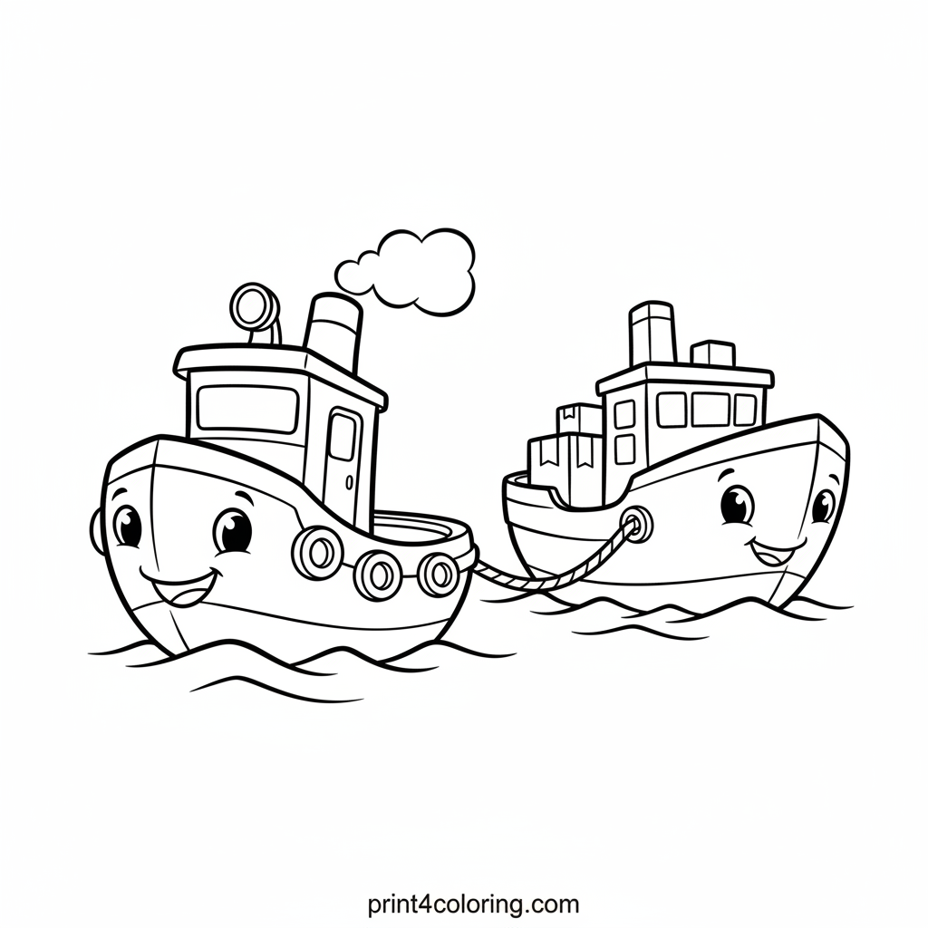 Join our brave little tugboat as it puffs out a cloud of smoke, showing off its strength! Watch it bravely pull a friendly, slightly larger cargo ship across the sparkling water. This cozy scene celebrates teamwork and the power of even the smallest boats. Get ready to add vibrant colors to this maritime adventure!