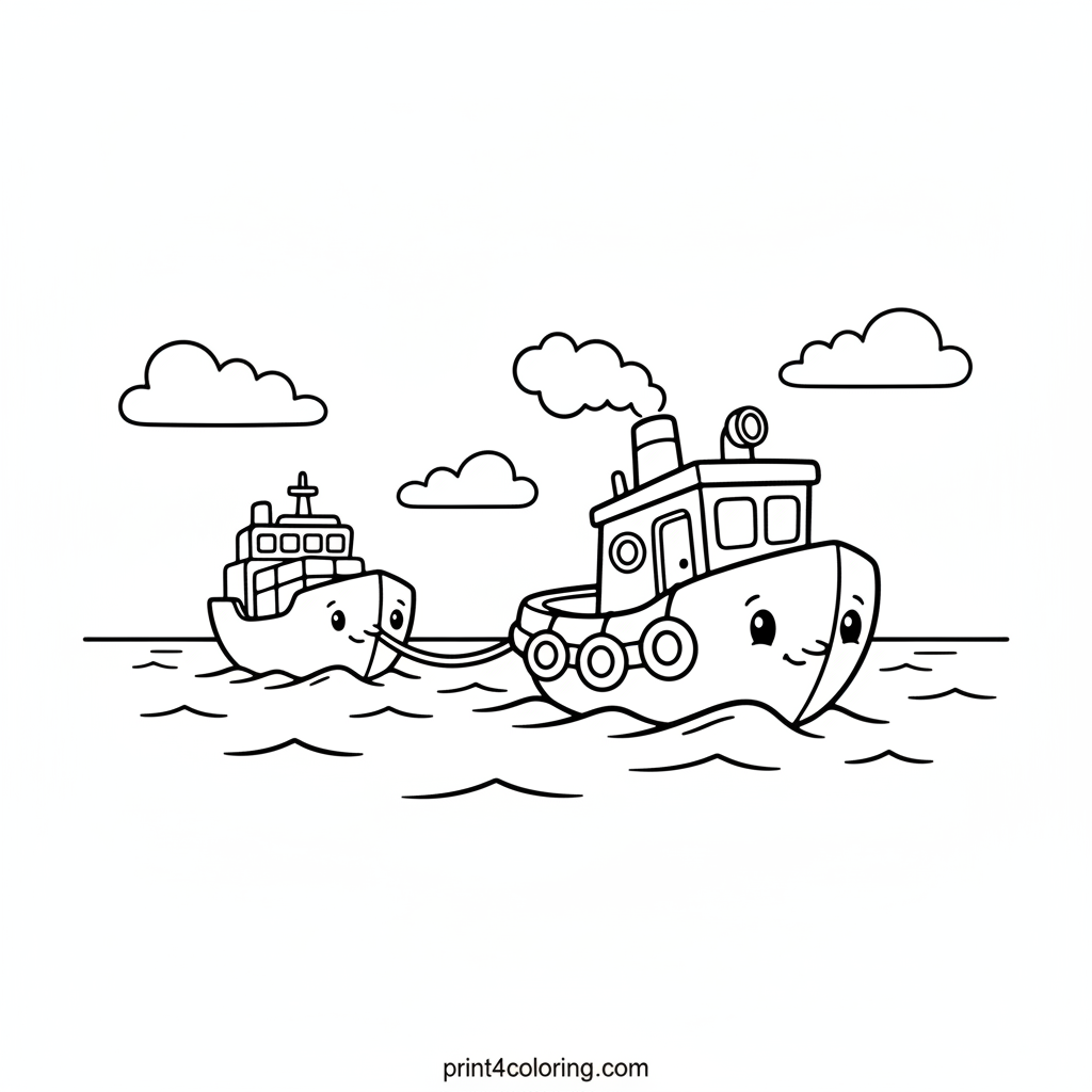 Join the brave little tugboat as it puffs out smoke, showing its mighty strength by pulling a friendly cargo ship across the sparkling water. This exciting scene captures a busy day at sea, perfect for young artists to color and imagine grand adventures on the waves.