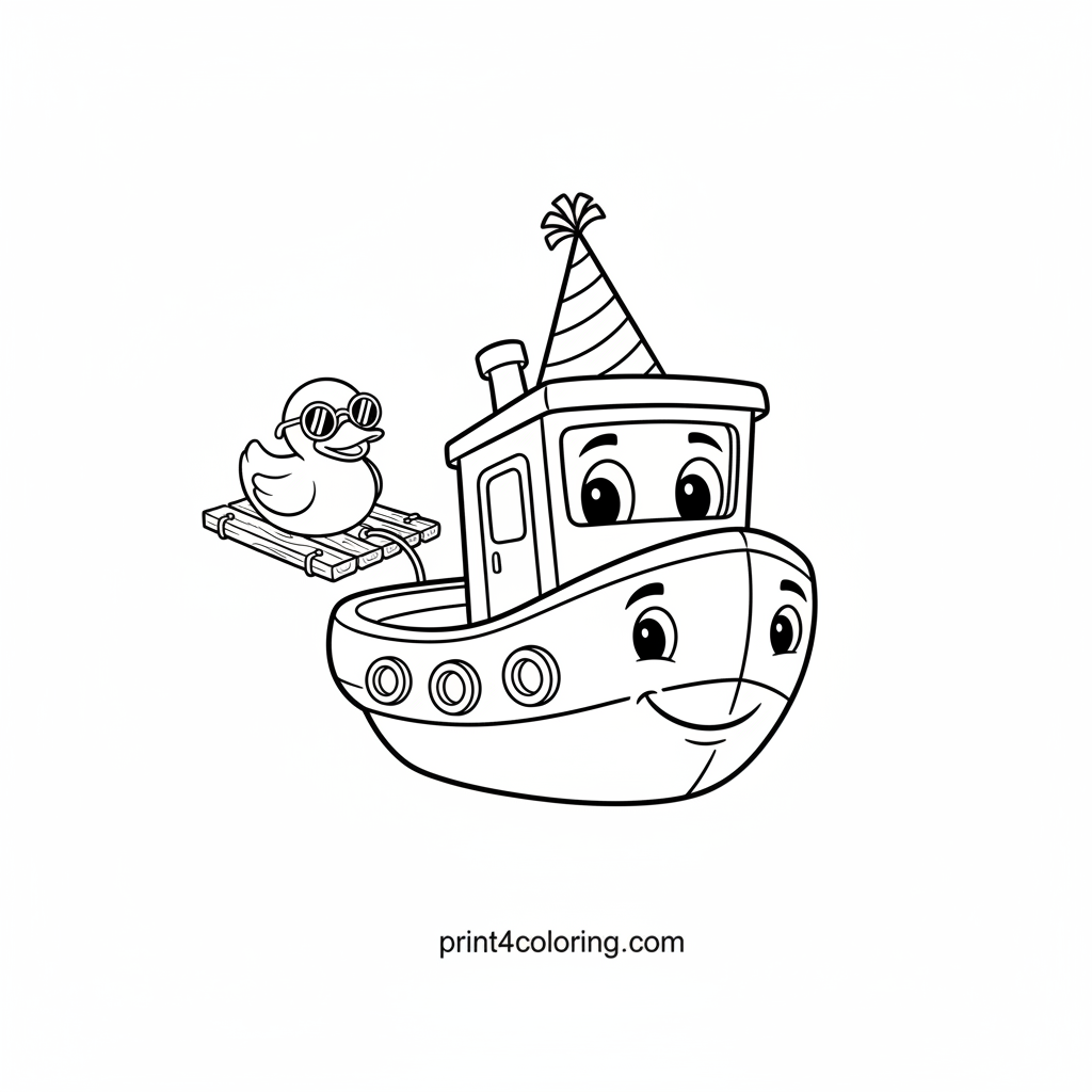 Get ready for giggles with this delightful tugboat! Our cheerful tug is sporting a fantastic striped party hat, playfully towing a tiny raft. On the raft, a giant, wobbly rubber duck wears cool sunglasses, ready for a fun day on the water. Add vibrant colors to this hilarious aquatic scene!