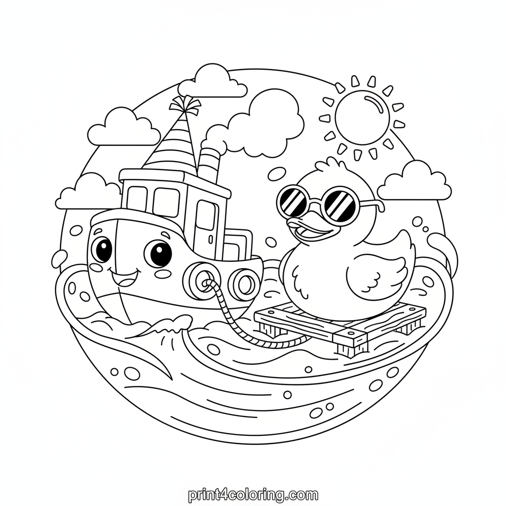 Join a cheerful tugboat on a delightful water adventure! This playful vessel proudly wears a brightly striped party hat, as it gently pulls a tiny raft carrying a giant, wobbly rubber duck. The duck, sporting cool sunglasses, adds to the fun, creating a truly giggle-worthy scene for you to color with your favorite shades!