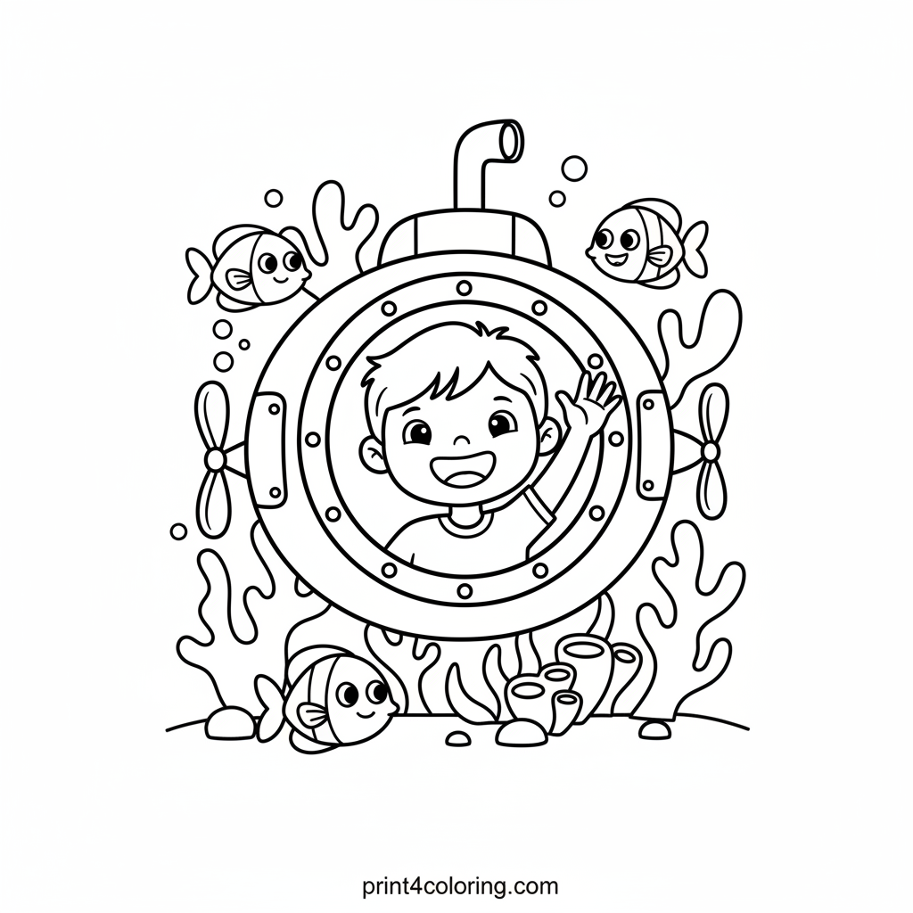 Dive into an exciting underwater world! This coloring page features a friendly submarine exploring a vibrant coral reef. A curious child waves from the porthole, surrounded by colorful fish darting through the amazing coral. Perfect for little adventurers who love ocean discovery!