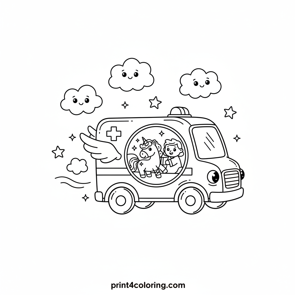 - 3✨ Ambulance Glow - Color the ambulance in bright, friendly colors like light blue or green. Add subtle yellow or white highlights around the wings to show its magical flight.