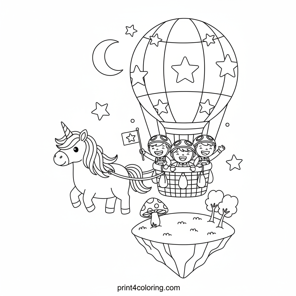 Join a magnificent unicorn and its explorer friends on an incredible journey! Soar through the night sky in a star-themed hot air balloon, discovering a hidden floating island filled with wonder. Imagine the sparkling horn and the magical landscapes as you bring this enchanting scene to life with your colors.