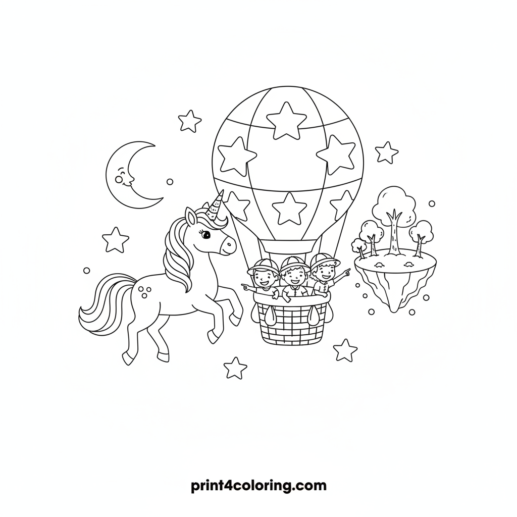 Join a magnificent unicorn and a group of joyful children as they embark on an incredible adventure! Soaring through the night sky in a whimsical, star-themed hot air balloon, they've just discovered a secret floating island. Imagine the wonders they'll find on this magical journey above the clouds. Let your colors bring this enchanting scene to life!