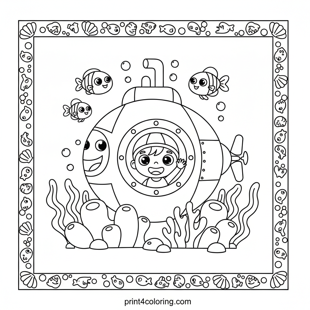 Dive deep into the ocean with our friendly submarine! A child waves excitedly from the porthole as colorful fish swim around a vibrant coral reef. Imagine all the amazing sea creatures you'll discover in this underwater world. Get ready to add your favorite colors to this exciting deep-sea adventure!