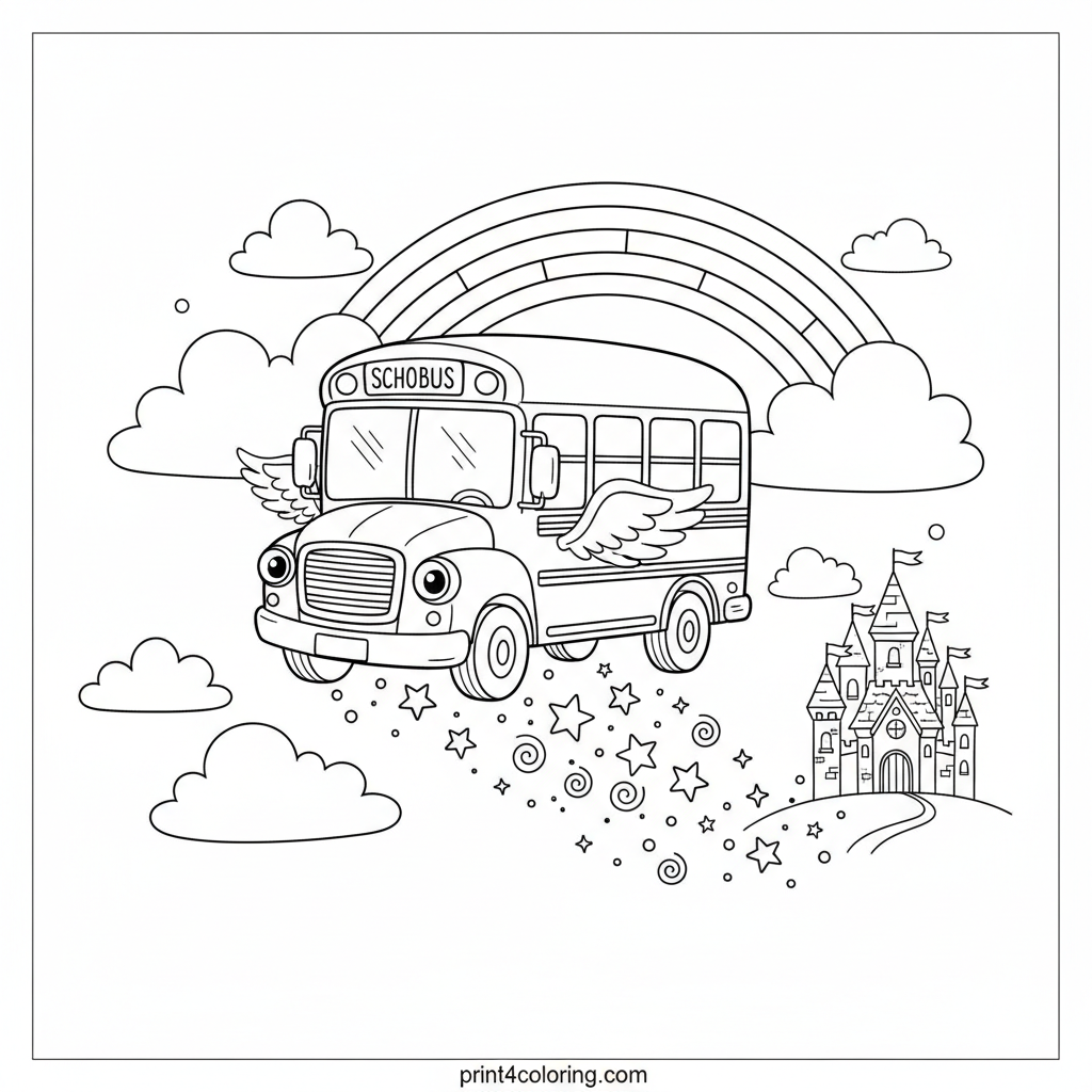 Embark on an enchanting journey with our magical flying school bus! Watch as it soars through fluffy clouds, leaving a sparkling trail, and passes a vibrant rainbow on its way to a whimsical castle. This scene is full of wonder, inviting young artists to bring its fantastical elements to life with their favorite colors and imagination.