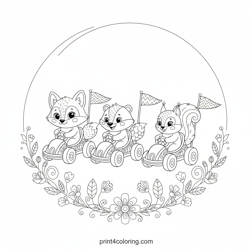 Whimsical Woodland Go-Kart Rally! Coloring Page