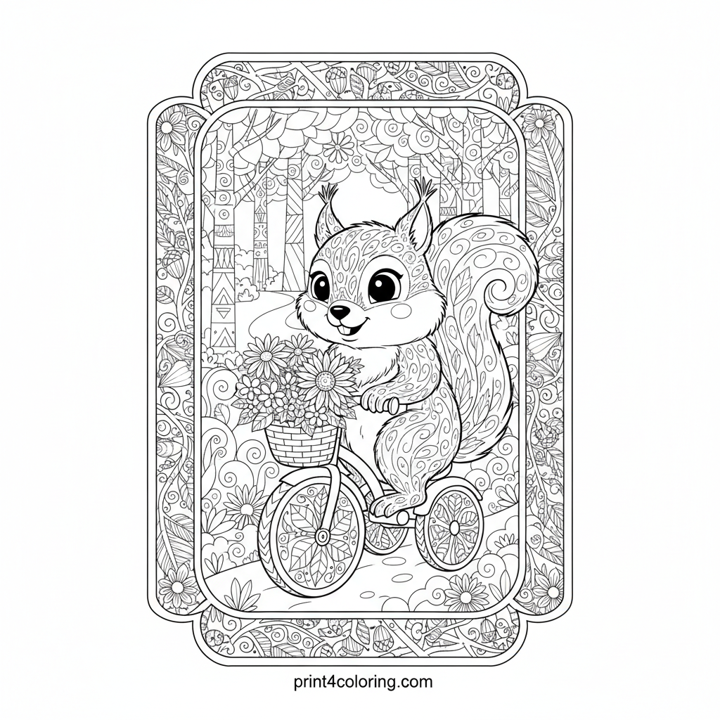 Embark on a charming adventure with a fluffy squirrel on his first tricycle ride! Explore a sun-dappled forest path, admiring his trike's intricate leaf and vine patterns. Discover the basket overflowing with wildflowers and whimsical, geometric foliage in the background. A delightful, detailed scene awaits your creative colors!
