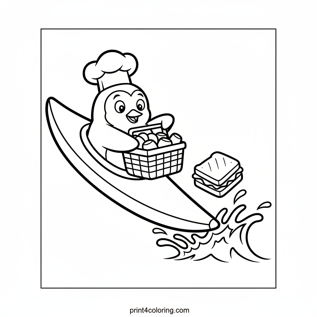 Get ready for a giggle with a clumsy but happy penguin! Wearing a chef's hat, he's trying to balance a picnic basket full of fish in a bright kayak. Oops, a sandwich just fell out, making a funny splash! Color this adorable, wobbly water scene.
