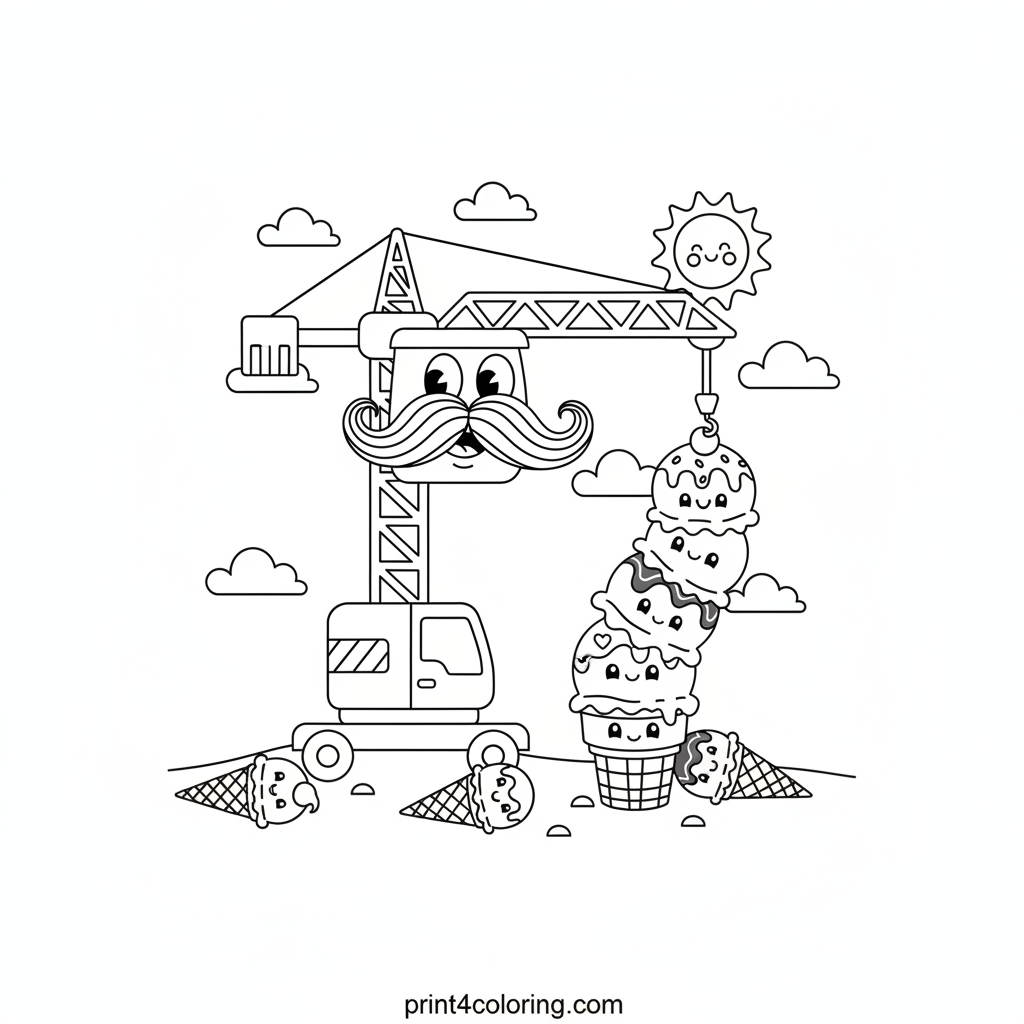 Get ready for a giggle with this cheerful construction crane! Sporting a funny, wobbly mustache, it's attempting the most delicious task ever: carefully stacking giant, colorful ice cream cones instead of heavy building blocks. Imagine a world where construction sites smell like vanilla and strawberry! Grab your brightest crayons and bring this silly, sweet scene to life.