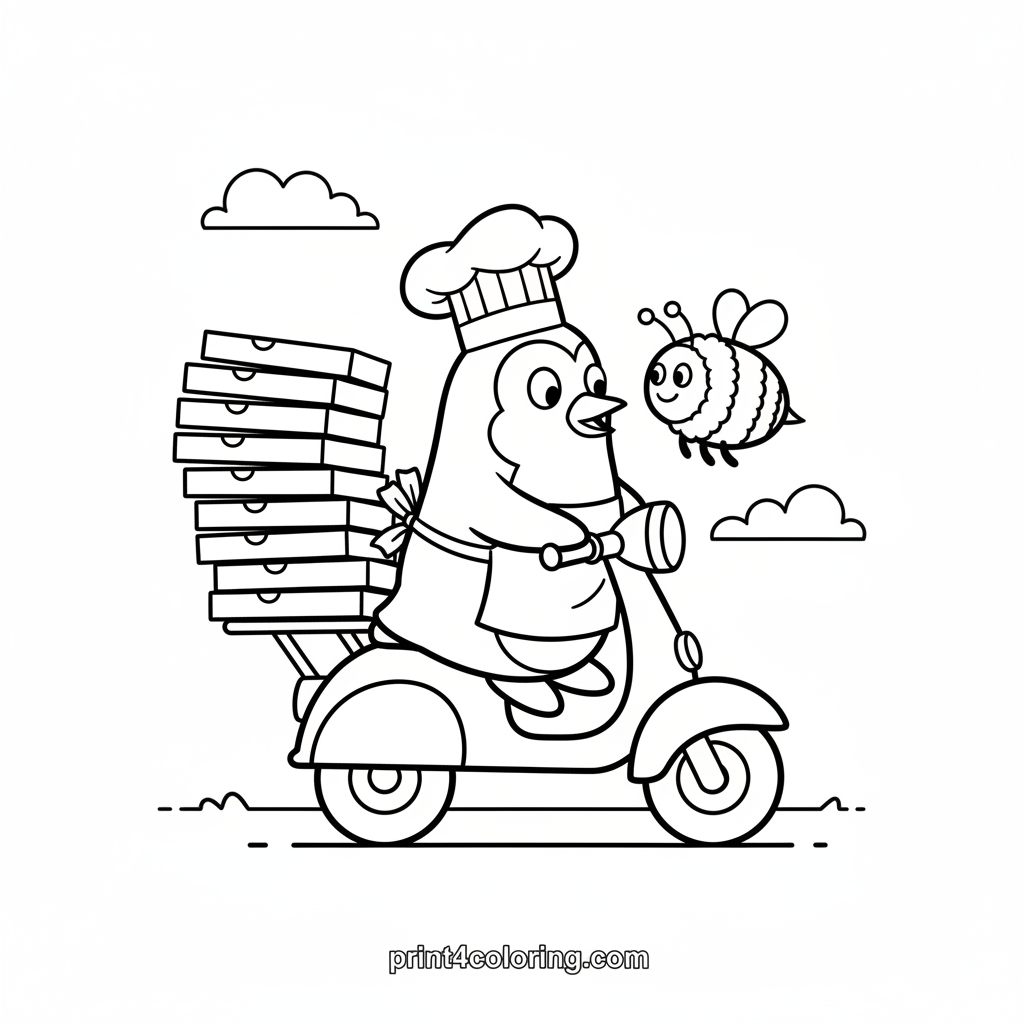 Join Pippin the cheerful penguin chef on his wobbly pizza delivery adventure! He's expertly balancing a towering stack of pizzas on his bright red scooter. A friendly bumblebee zips by, giving Pippin a surprised, funny look. Add vibrant colors to this delightful, delicious scene!