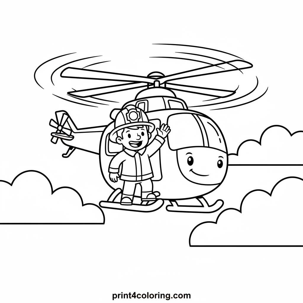 Get ready for a high-flying adventure! This coloring page features a powerful rescue helicopter soaring through the sky with its blades spinning. A brave firefighter waves from the open door, ready to save the day. Grab your crayons and bring this exciting rescue scene to life with vibrant colors!